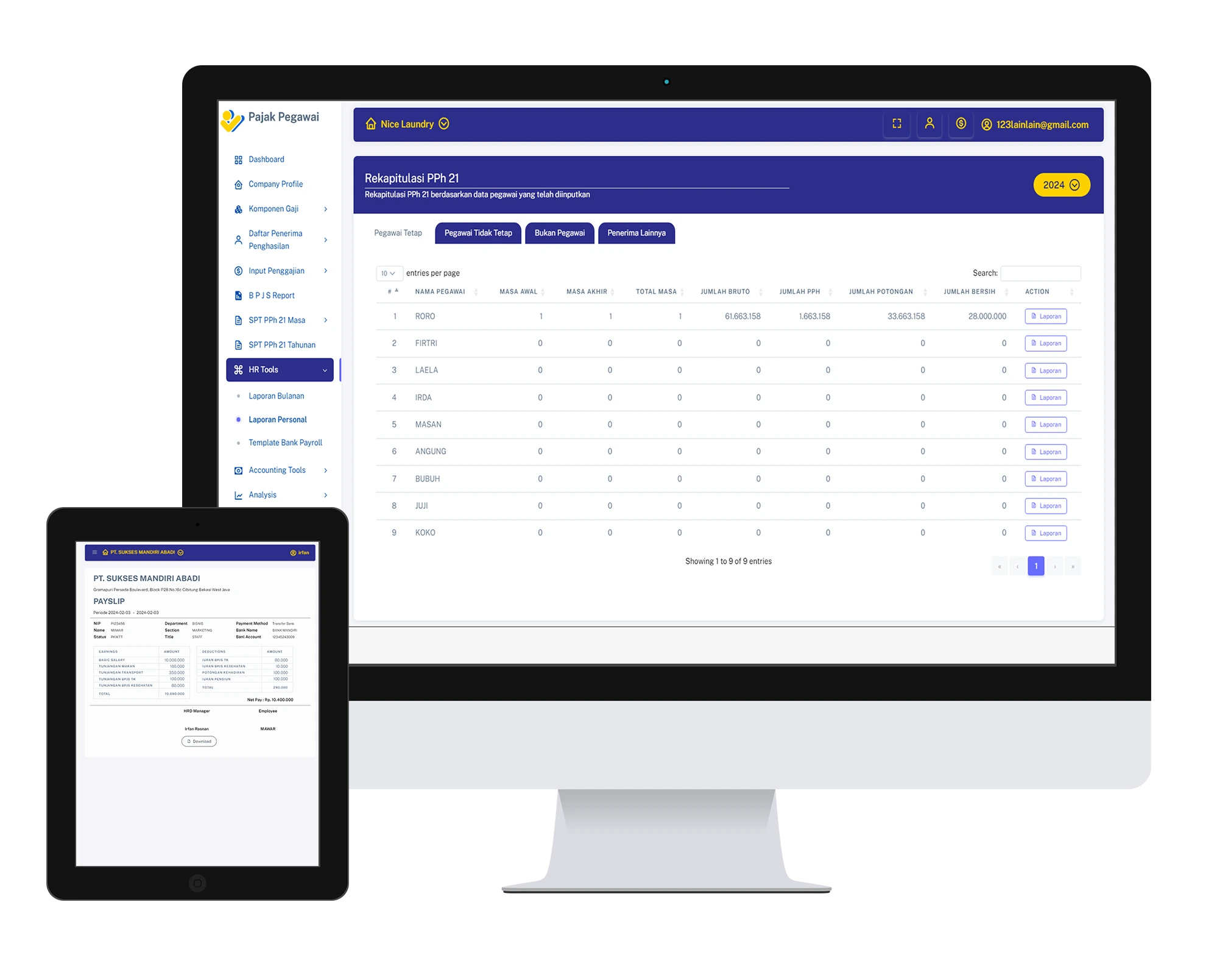 Unggah data gaji dan tunjangan, unduh slip gaji, dan kirim slip otomatis ke email karyawan.